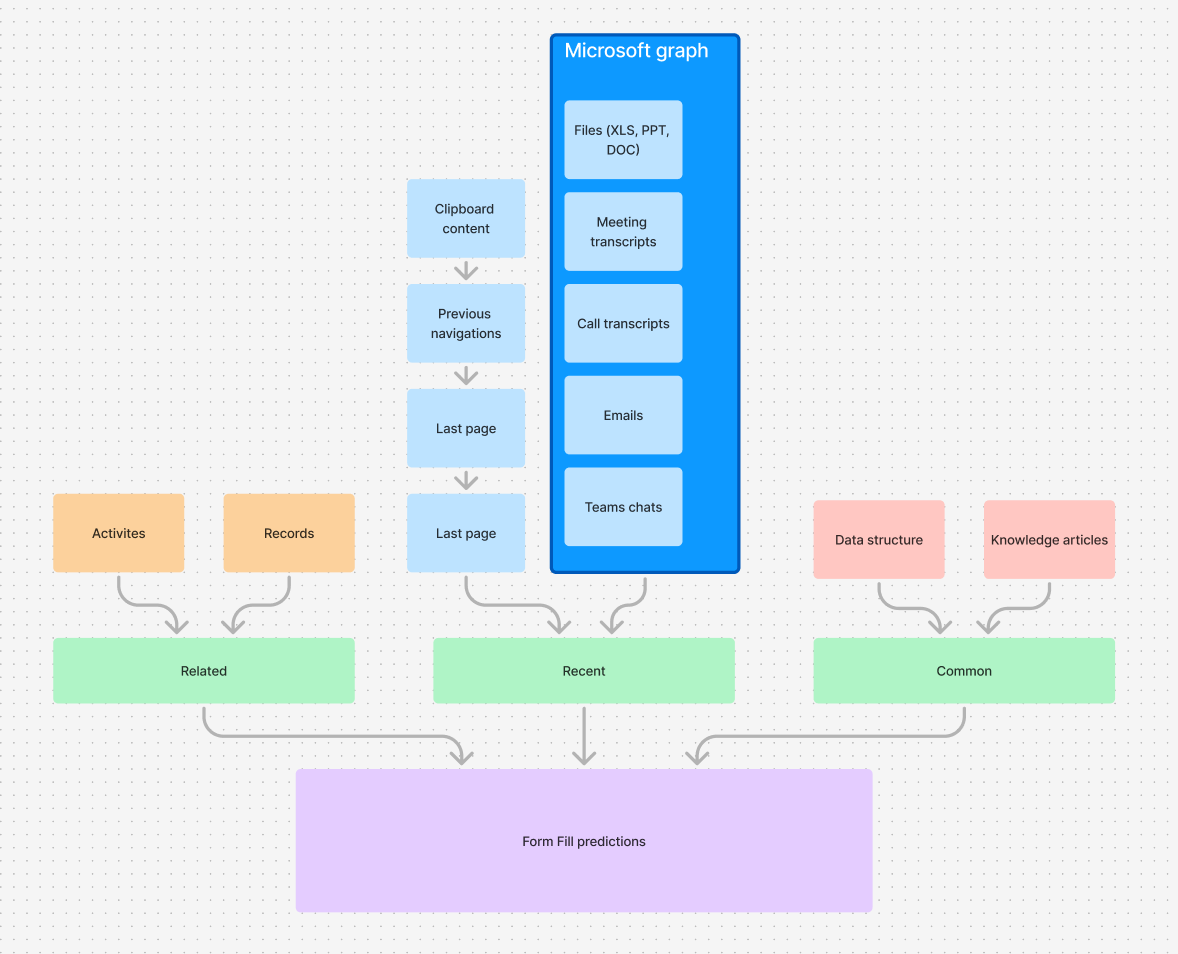 The prediction model would need to detect patterns in recent user activity, including past form entries. Over time, we aimed to incorporate data sources such as recent emails, meetings, and calls for even more precise predictions.